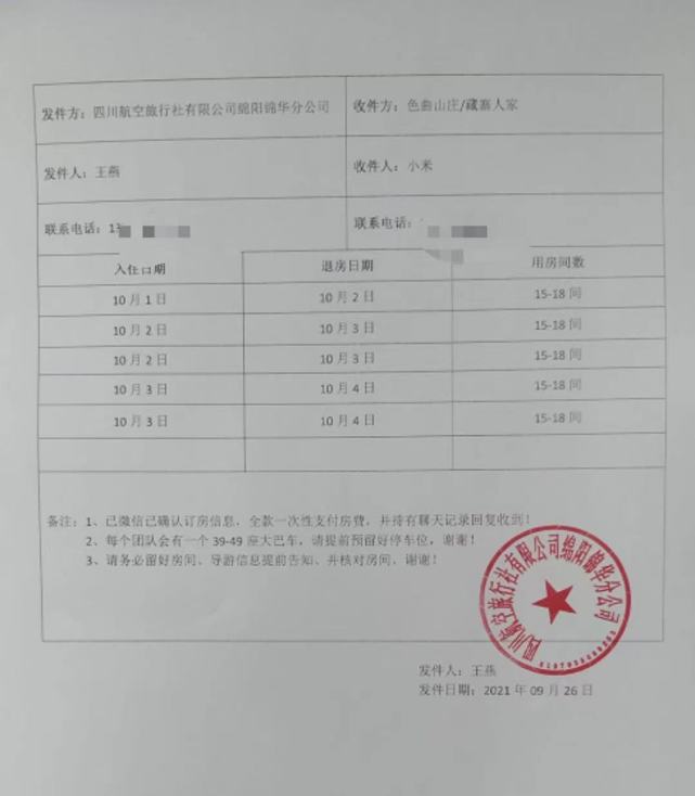 四川航空旅行社有限公司绵阳锦华分公司负责人表示,旅行社于9月14日开始与酒店对接2021年国庆节的用房情况,并确定了宾馆房间,后在9月25日确定了宾馆价格,并于9月26日告知宾馆具体的国庆用房数据,签订订房协议,根据协议内容持订房协议,全款一次性支付房费。10月2日晚,导游携游客抵达酒店后方被告知无法入住,后在当地110的帮助下,把客人安排到其他酒店住下。10月3日,导游先后多次与酒店确认,但当晚再次被告知没有房间。