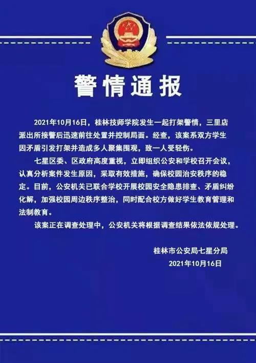 据“平安桂林七星”微信公众号消息,2021年10月16日,桂林技师学院发生一起打架警情,三里店派出所接警后迅速前往处置并控制局面经查,该案系双方学生因矛盾引发打架并造成多人聚集围观,致一人受轻伤。