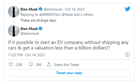 对此,马斯克在这条推文下回应道:“这真是奇怪的日子。”紧接着又发布了一条:“有没有可能创办一家电动汽车公司,在未交付任何汽车的情况下估值低于10亿美元!?”