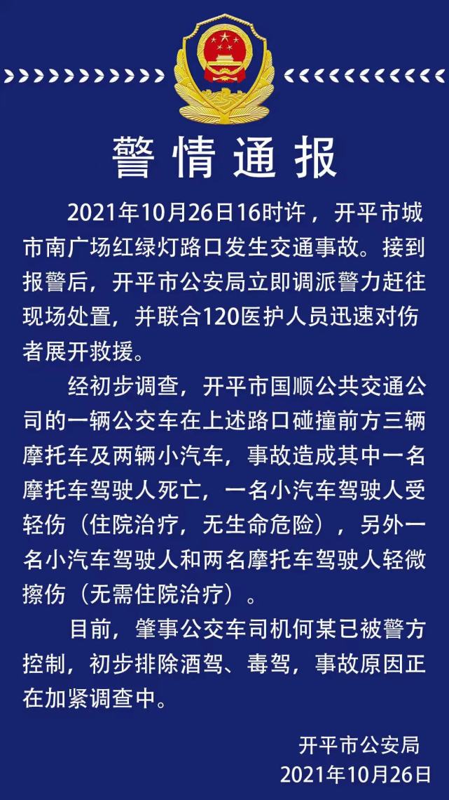 经初步调查,开平市国顺公共交通公司的一辆公交车在上述路口碰撞前方三辆摩托车及两辆小汽车,事故造成其中一名摩托车驾驶人死亡,一名小汽车驾驶人受轻伤(住院治疗,无生命危险),另外一名小汽车驾驶人和两名摩托车驾驶人轻微擦伤(无需住院治疗)。