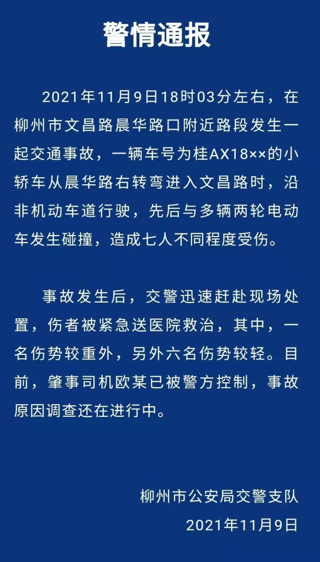 11月9日,据柳州市公安局交警支队通报,2021年11月9日18时03分左右,在柳州市文昌路晨华路口附近路段发生一起交通事故,一辆车号为桂AX18xx的小轿车从晨华路右转弯进入文昌路时,沿非机动车道行驶,先后与多辆两轮电动车发生碰撞,造成七人不同程度受伤。
