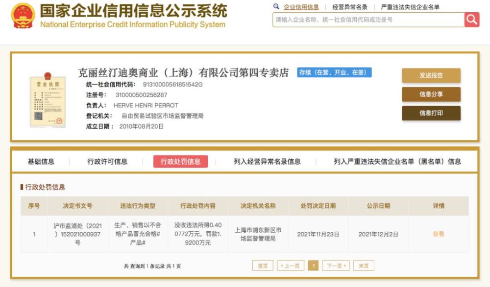 今年9月,克丽丝汀迪奥商业(上海)有限公司生产、销售不合格T恤衫,曾被静安区市场监督管理局予以行政处罚,处以罚金5.76万元。