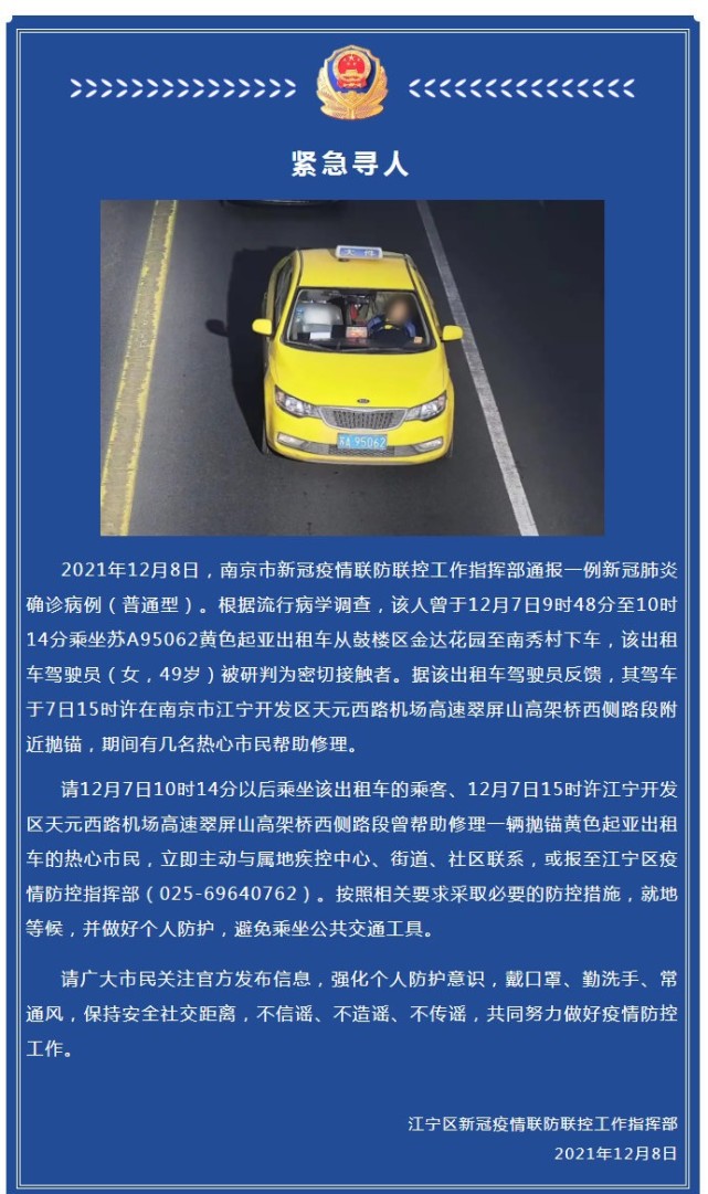 南京市江宁区新冠疫情联防联控工作指挥部12月8日发布寻人通报称,南京一新冠肺炎确诊病例曾于12月7日乘坐车牌为苏A95062的出租车,该出租车驾驶员被研判为密切接触者。请12月7日10时14分以后乘坐该出租车的乘客及帮忙修车的热心市民立即主动与属地疾控中心、街道、社区联系,或报至江宁区疫情防控指挥部。