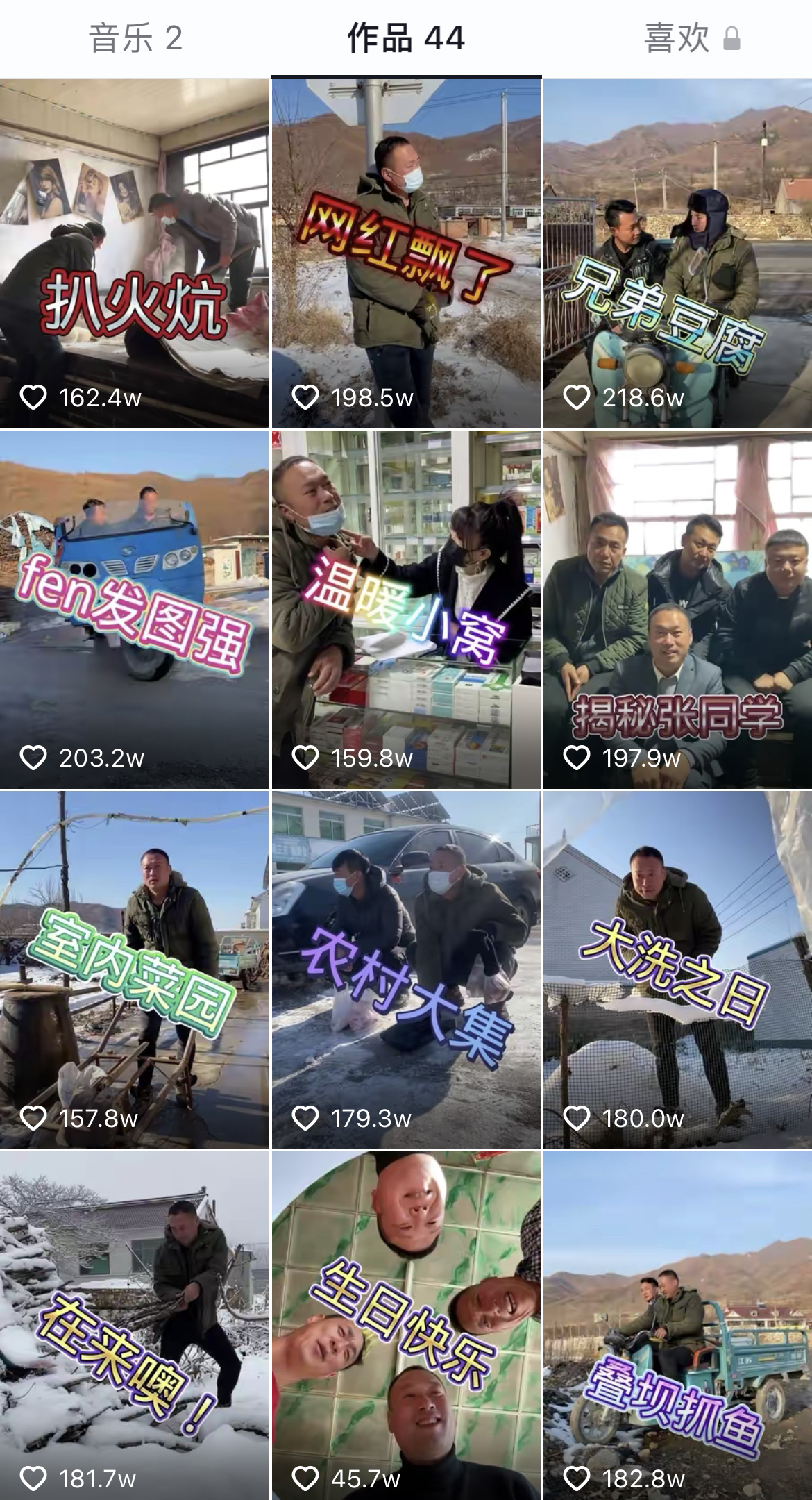44个视频作品,涨粉1487万,播放量过亿,来自东北农村的短视频博主“张同学”仅用2个月就拿下了这样傲人的数据。张同学的土味视频里,抓鱼喂鸡干农活,唠嗑赶集,跟朋友喝酒吃肉,简朴平淡的农村日常生活让网友“不羡鸳鸯不羡仙,只羡大哥每一天”。