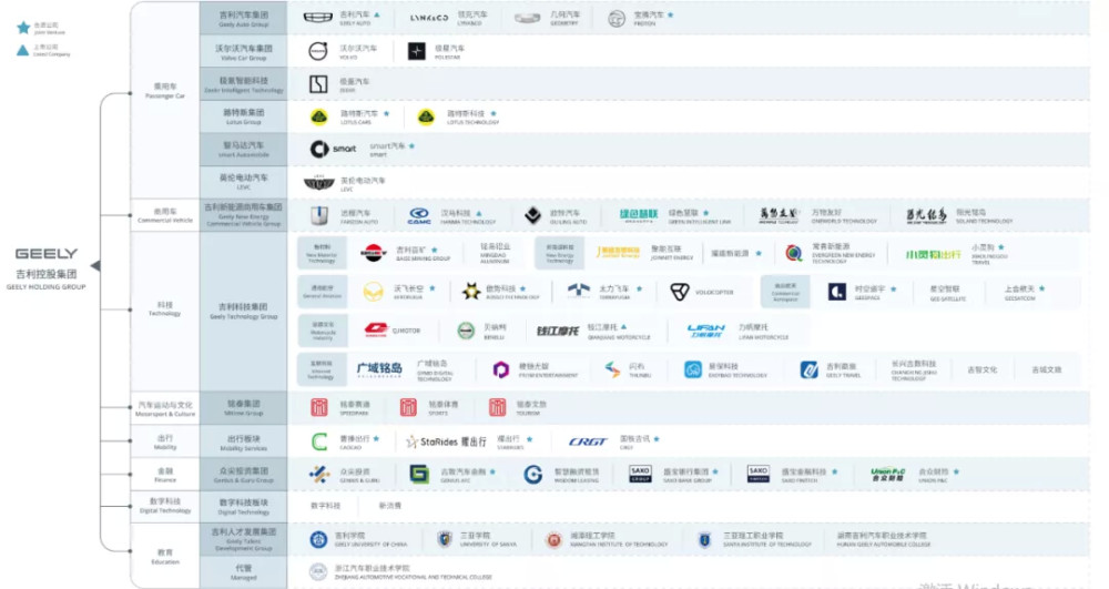 目前,吉利在乘用车领域,拥有吉利汽车集团、沃尔沃汽车集团、极氪智能科技、路特斯集团、智马达汽车、英伦电动汽车等6大板块,是投资最为丰富与集中的领域,各板块下还往往包括多个汽车品牌。