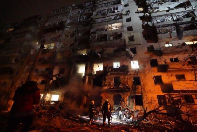 乌克兰紧急情况部门发布基辅市南部城区建筑物受损图片