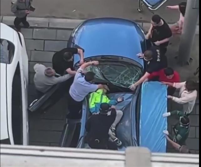 这一幕被多名居民看到,他们拍摄的图片和视频显示,男孩躺在一辆蓝色轿车顶上,车顶已经被砸塌陷。民警和120工作人员正在现场救援。