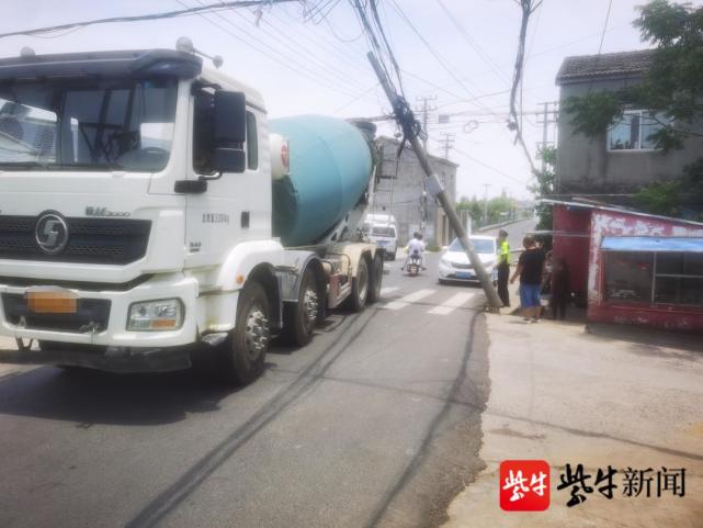 近日,南京江宁湖熟交警中队接到报警,称在湖熟街道宋家边路段上,有一辆搅拌车因超高,拉拽到横跨小道上面的电线,还将路边的电线杆连带着拉断,导致周围部分居民家受到影响。