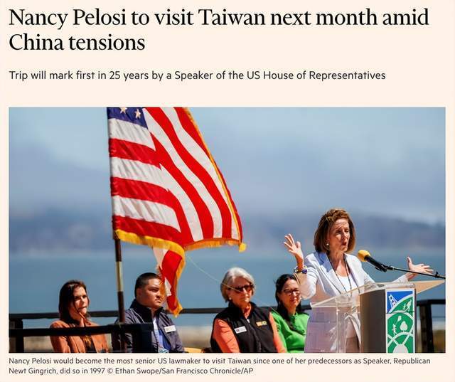 7月19日,英国《金融时报》引述多名“知情人士”消息称,佩洛西正计划8月出访亚洲,行程将包括“访问”中国台湾地区。