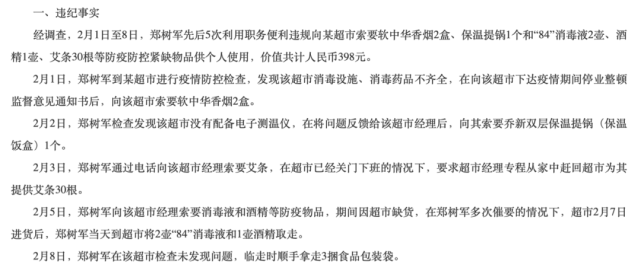 通报提到,郑树军8天时间5次向被监督检查对象索要财物用于个人家庭使用,在超市没有消毒液和酒精等疫情防控紧缺物资的情况下,多次督催索要,甚至要求超市经理在关门下班后专程从家中赶回为其个人提供艾条,其行为俨然是典型的“官老爷”作派,严重侵害了群众的利益,严重伤害了群众的感情,严重损害了党和政府公职人员的形象。