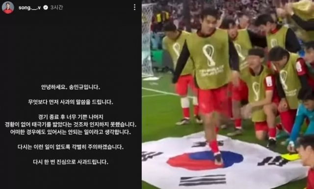 韩国“edaily”媒体称,随着争议扩大,由此引来的恶评不断,松旻揆在其社交媒体账号上发文道歉。他称自己当时因为太过高兴,以至于都没有意识到已经脚踩国旗。“我认为在任何情况下都不应发生这样的事。以后我会多加注意,不再出现类似情况。再次向各位道歉”松旻揆在道歉文中说道。