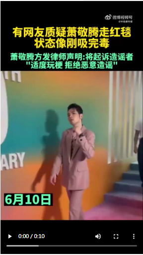 “脚步虚浮,两眼无神,瞳孔放大,这是嗑飘的状态”,近日,萧敬腾红毯状态遭质疑像刚吸完毒。6月10日,萧敬腾工作室就部分用户在网络上大肆散布、传播有关于萧敬腾先生出席活动的视频恶意解读、曲意传播、恶意评论,引发重大网络舆情的行为,发布律师声明。