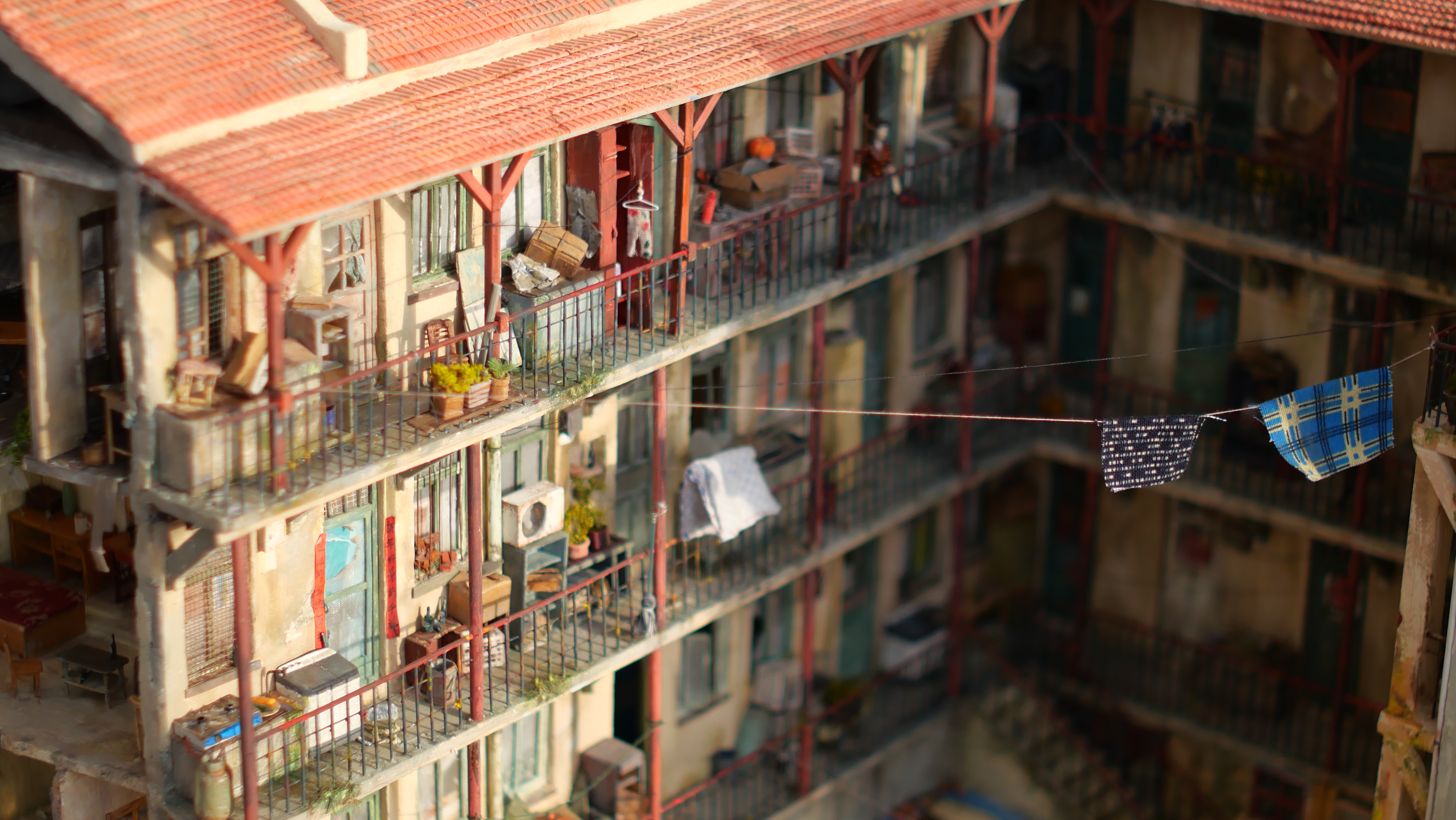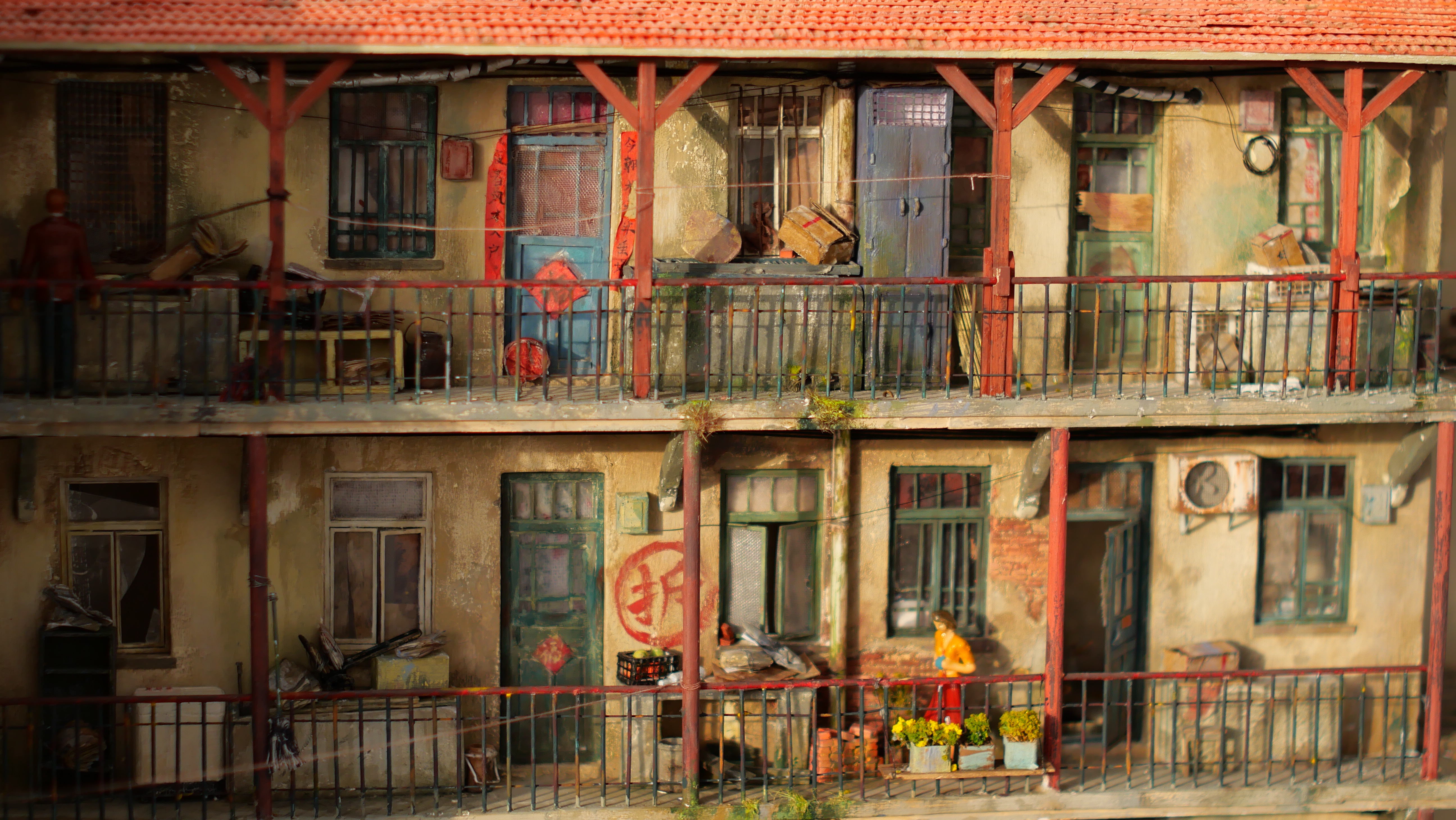 墙壁上裸露的红墙砖、锈迹斑斑的铁栏、爬上阳台的青苔、卷起了一角的春联、没有玻璃的铁窗……无数的细节让这件作品显得十分真实,许多网友认为在镜头下能以假乱真,媲美电影中的布景。杨刚告诉记者,自己的毕业设计从去年底立项,单是外出考察就花了三个月,比在工作室里制作的时间还要长。“我们遇到了许多困难,我们设想的是打造千禧年间的里院,而现在青岛的大部分里院,包括这次原型‘平康五里’都被改造得焕然一新,为此我们还找了很多老照片,走访了不少老街老巷。”被网友们称为“细节满分”的卷角春联,就是一行人在走访中的收获,“作品定位的季节是春夏,离春节有些日子了,我们走访中发现一些人间过年贴的春节,因为胶水老化等原因会卷角,这个细节就沿用到作品中了。”