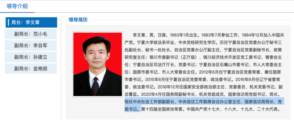 更新后的“国家信访局”官网显示,李文章现任中央社会工作部副部长,中央信访工作联席会议办公室主任,国家信访局局长、党组书记。