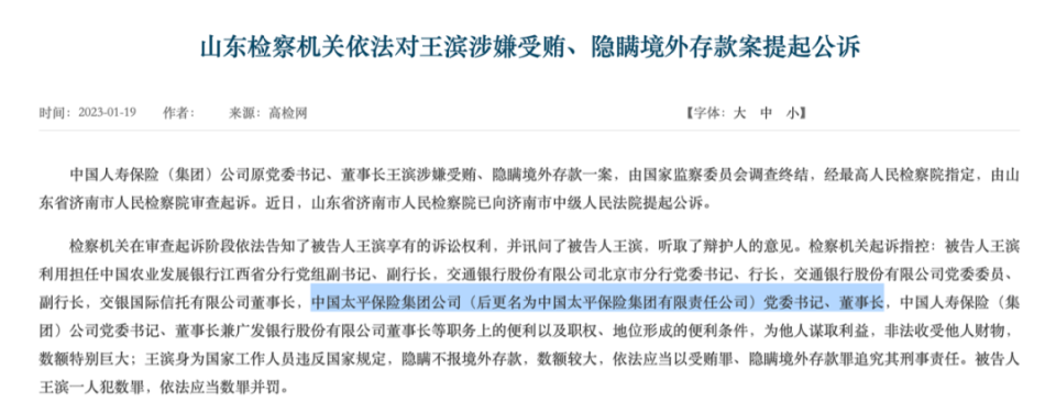 2022年1月,中国人寿保险(集团)公司党委书记、董事长王滨被查。