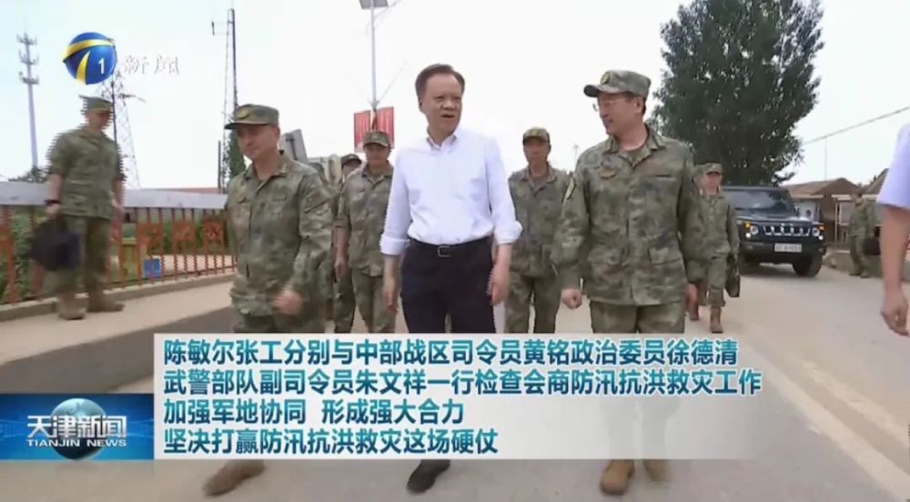 8月8日,天津市委书记陈敏尔、市长张工分别与中部战区司令员黄铭、政治委员徐德清,武警部队副司令员朱文祥一行到静海区大清河右堤检查会商天津市防汛抗洪救灾工作。