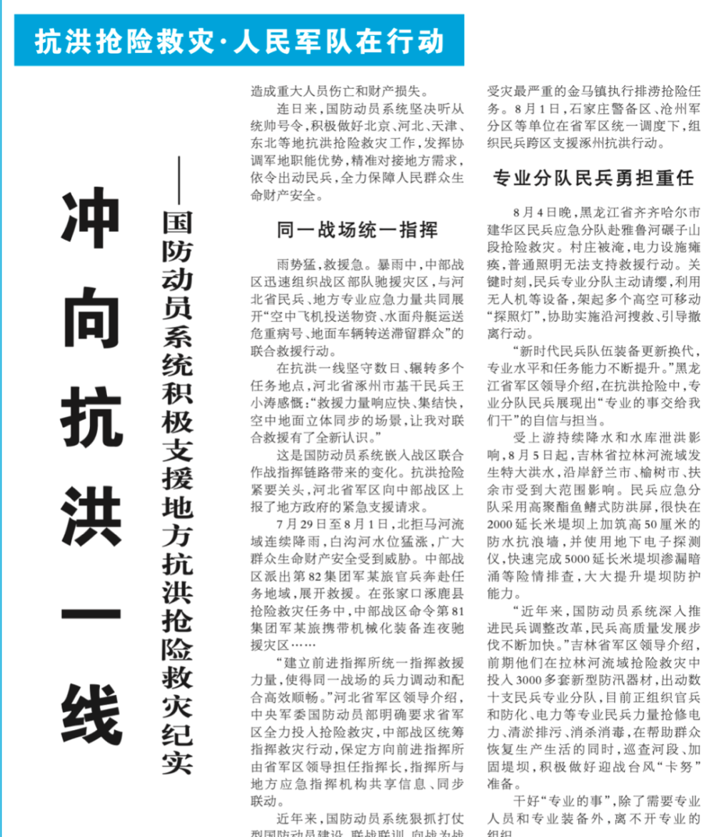 8月12日,《解放军报》头版刊发了《冲向抗洪一线——国防动员系统积极支援地方抗洪抢险救灾纪实》文章。