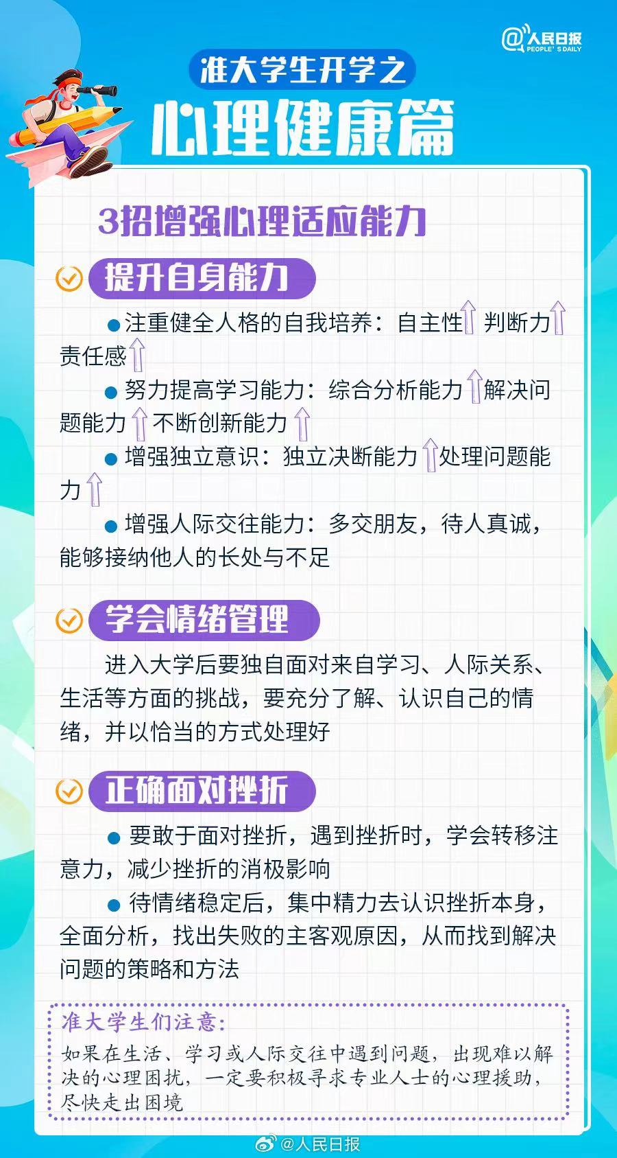近日部分高校陆续官宣新生报到时间。@准大学生们,你做好准备了吗?要带好的证件、要了解的政策、要定好的小目标……收好这份准大学生入校报到一站式清单!愿你在大学四年里做好规划,开拓无限可能,加油!