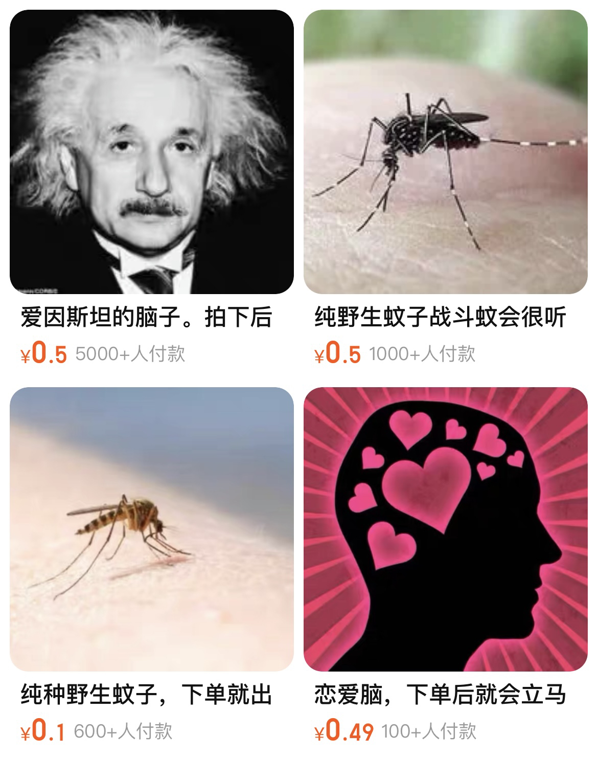 “爱因斯坦的脑子”商品详情中写道“本商品为虚拟产品,无需物流发货,拍下后自动发货,请直接确认收货……拍下后提供娱乐聊天服务,自己去找客服聊天,娱乐项目,介意者慎拍”,有人在留言区询问“买回来的是什么?”下面有买家回复,“买了自动变聪明”、“好用极了,买了考试后遇到了都是我会的题目”,还有买家指出,“就是买个心理安慰”、“买一份信念感”。还有人认为“爱因斯坦的脑子”就是智商税,“毫无用处”、““买完才意识到我很傻,果然变聪明了”、“上传个爱因斯坦图片,就能赚这么多钱了?”