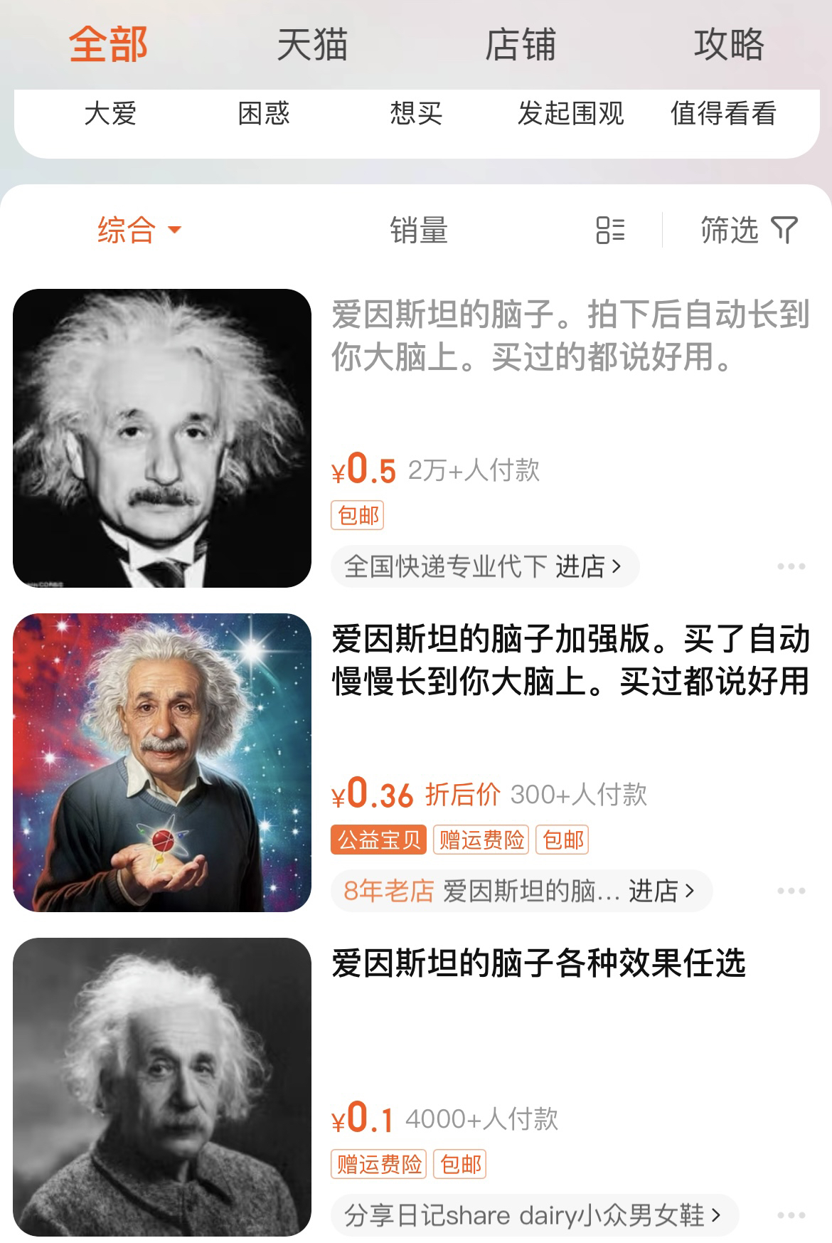 记者注意到,电商平台上卖“爱因斯坦的脑子”的商家不少,有商家还玩出了花活,对商品进行了分类:聪明脑、开心脑、文科脑、理科脑、考试脑……其中开心脑只要0.1元,考试脑则需要1元,商品下方还做了提示“可以备注给某某长脑,需要其他脑请联系客服。”随后记者咨询了客服,客服表示,“拍下自动发货,虚拟物品秒发货噢,下单后就等着变聪明吧,一般睡一觉就可以开始长脑啦。”这些商家都是以爱因斯坦的头像作为商品图,售价从0.1元到1元不等,除了销量超两万的,还有不少销量几千的。