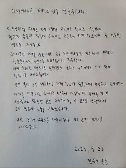 韩国男网种子选手权纯雨手写道歉信 图源:韩媒