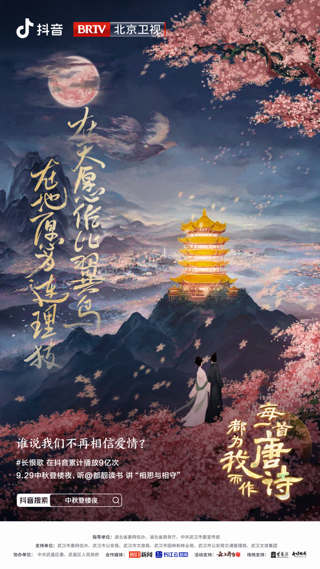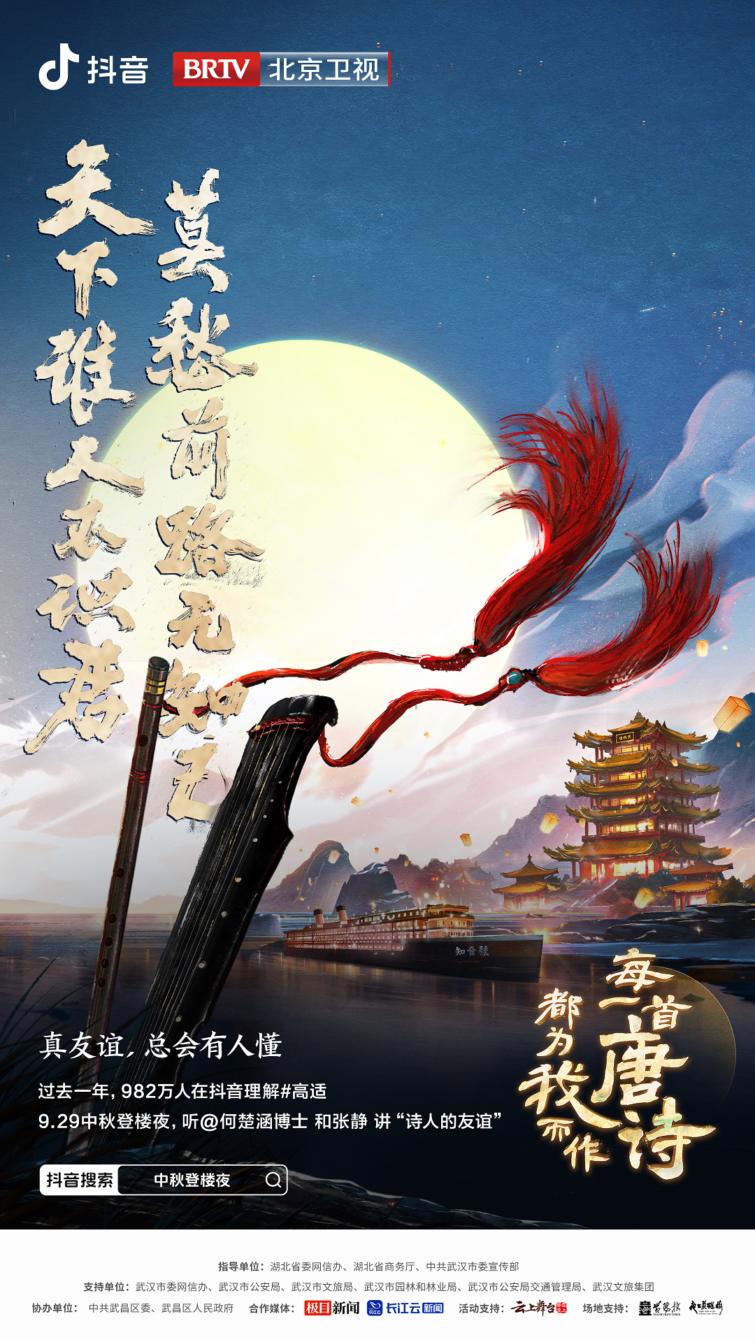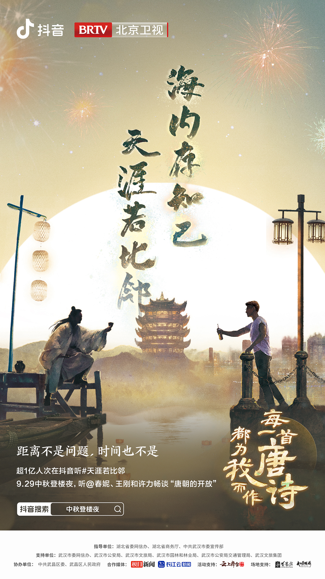 由抖音联合北京卫视共同打造的《“每一首唐诗都为我而作”2023抖音中秋登楼夜》晚会今晚19:30在北京卫视诗意播出。晚会邀请了王刚、吴克群、车保罗等明星嘉宾,与复旦大学骆玉明教授,南开大学张静教授,六神磊磊、都靓等抖音知识创作者,登黄鹤楼,赏中秋月,品读不一样的唐诗中秋晚会。