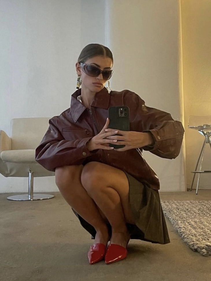 用内敛的暗红色皮包和slingback,把经典短款风衣穿出了美艳味道,皮质的油润光泽,让人联想到美拉德反应呈现的油脂感,紧扣秋冬流行主题。