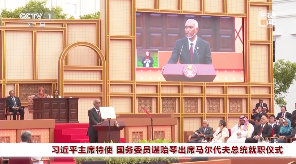据央视11月18日晚报道,应马尔代夫总统穆伊兹邀请,习近平主席特使、国务委员谌贻琴11月17日在马首都马累出席穆伊兹总统就职仪式。11月18日,穆伊兹在总统府会见谌贻琴。