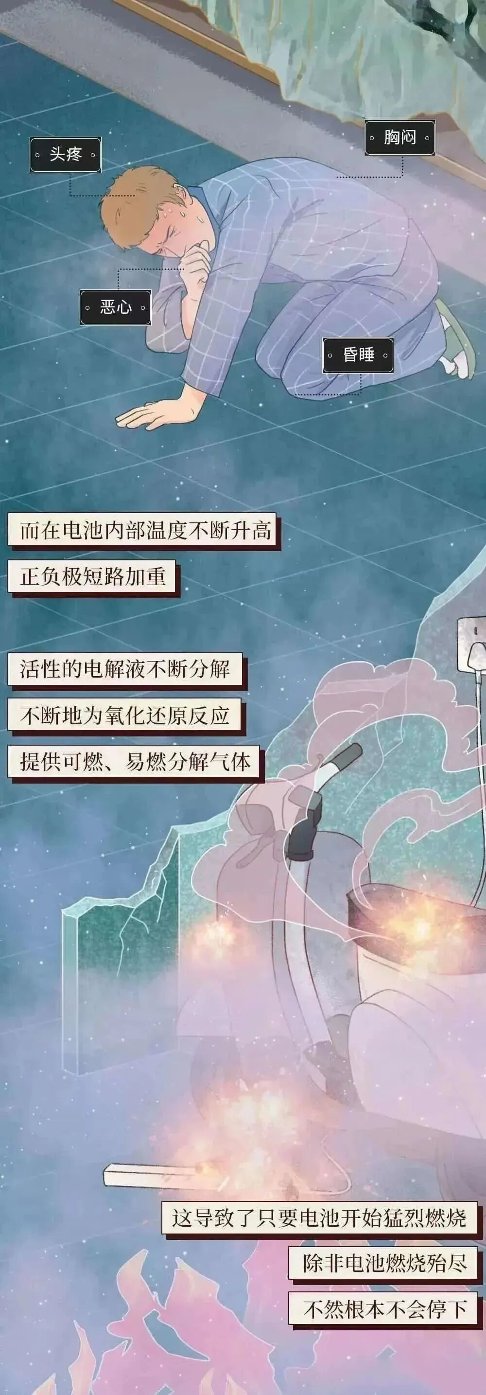 最后,这还有一组漫画帮您了解因不规范充电引发悲剧的全过程。
