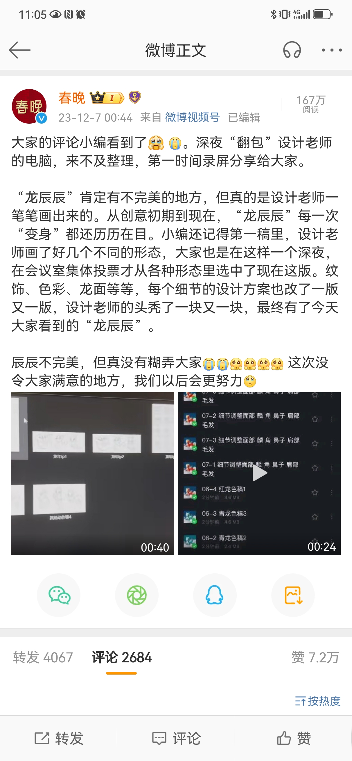春晚官方还放出了设计师电脑的录屏,给网友们看“龙辰辰”的设计过程。“辰辰不完美,但真没有糊弄大家。这次没令大家满意的地方,我们以后会更努力。”