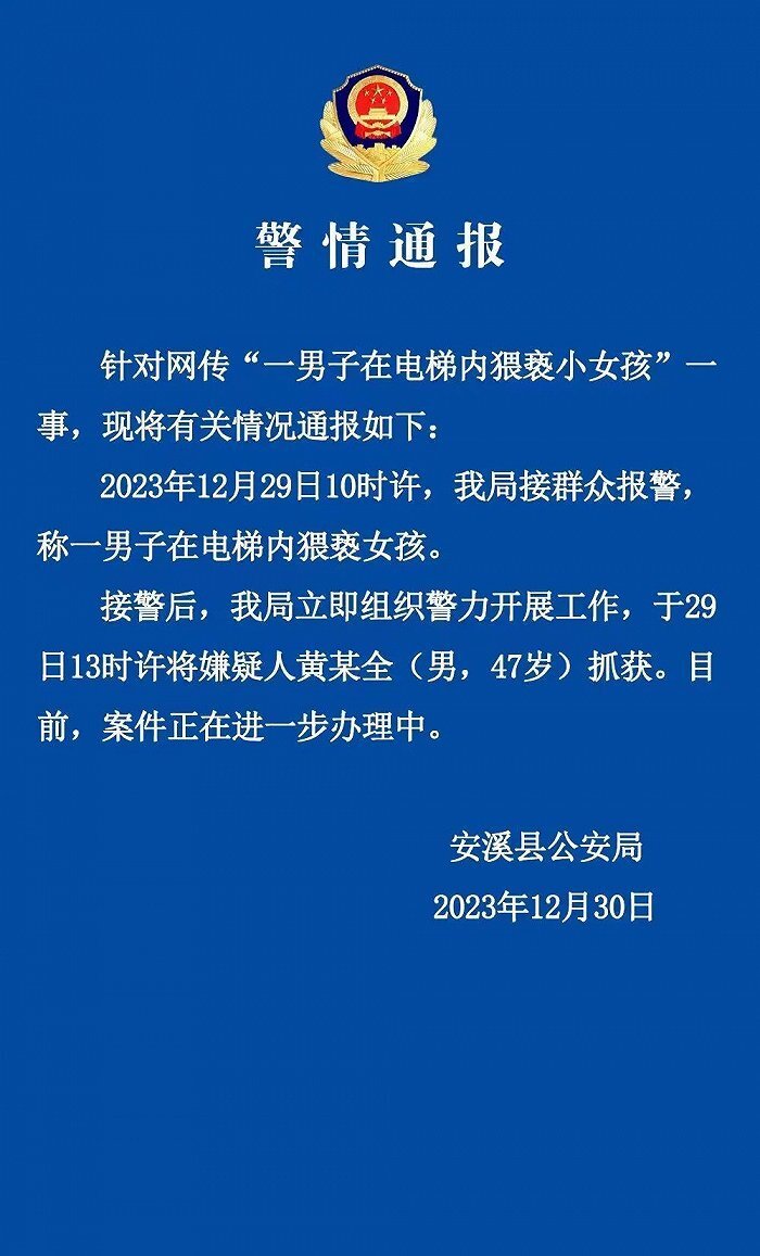 12月30日,福建安溪公安通报网传“一男子在电梯内猥亵小女孩”有关情况:12月29日10时许,我局接群众报警,称一男子在电梯内猥亵女孩,接警后,我局立即组织警力开展工作,于29日13时许将嫌疑人黄某全(男,47岁)抓获。目前,案件正在进一步办理中。