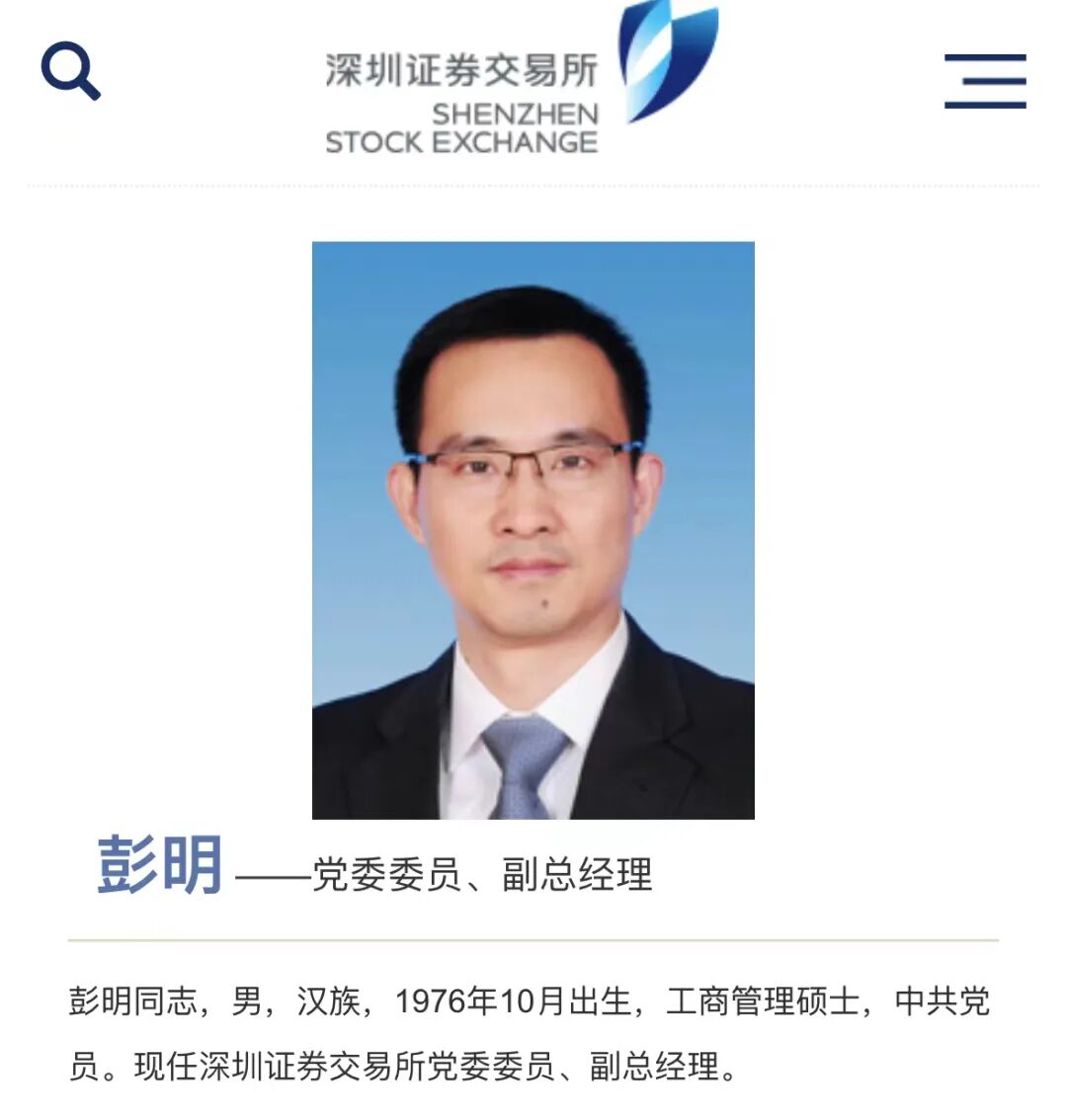 公开信息显示,彭明出生于1976年10月,工商管理硕士,中共党员。2000年10月起在深交所工作,曾历任稽核审计部副总监、纪检监察室主任、市场监察部总监、办公室(党委办公室)主任。2017年10月以来任深交所党委委员、副总经理。