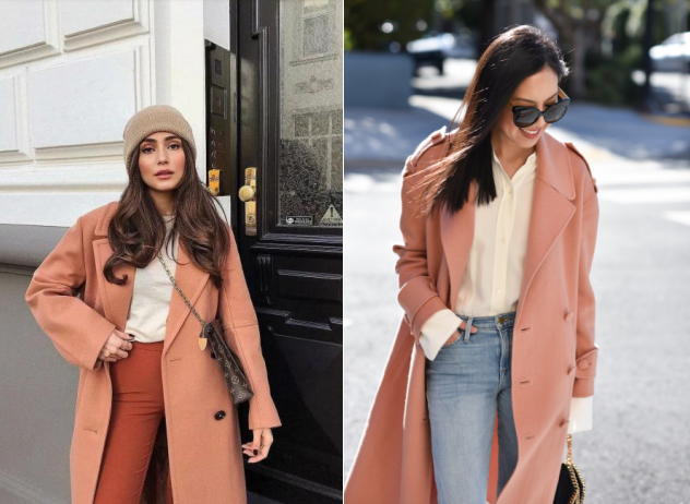 柔和桃大衣包裹白色内搭,将整个人衬托得更加柔和,如果你是春季型人,即暖调肤色,浅色的发色,更建议多尝试这个颜色,很衬肤色也能放大明媚活泼的特点。“peach fuzz”有桃子绒毛的含义,正如柔和桃搭配白色,一颗鲜嫩多汁的蜜桃与一层淡淡白色的小绒毛,给人一种视觉吸引力。