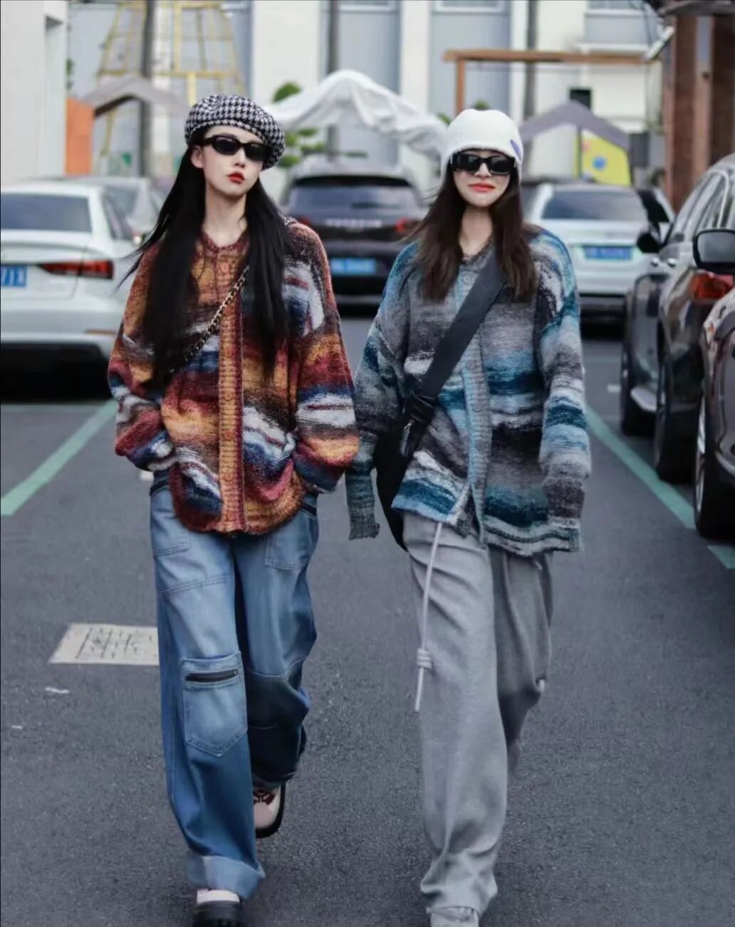 第三套闺蜜穿搭,美式街头感针织外套,左边大地色系,右边蓝色系,一暖一冷的色系搭配,走在路上更加吸睛,各自搭配一顶帽子,深浅呼应,一起做街头的时尚潮酷女孩。