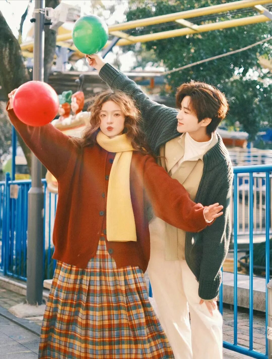 第一套情侣穿搭,红绿cp,红色与绿色搭配好就是炸街cp,女生穿红色针织衫,男生穿深绿色针织衫,不仅让画面丰富起来,两个人的颜色深浅恰到好处,一眼识别“我们是一起的”,把红绿搭配好的技巧就在于红色与绿色的明度不能高,深红色与深绿色就仿佛是天生的cp。
