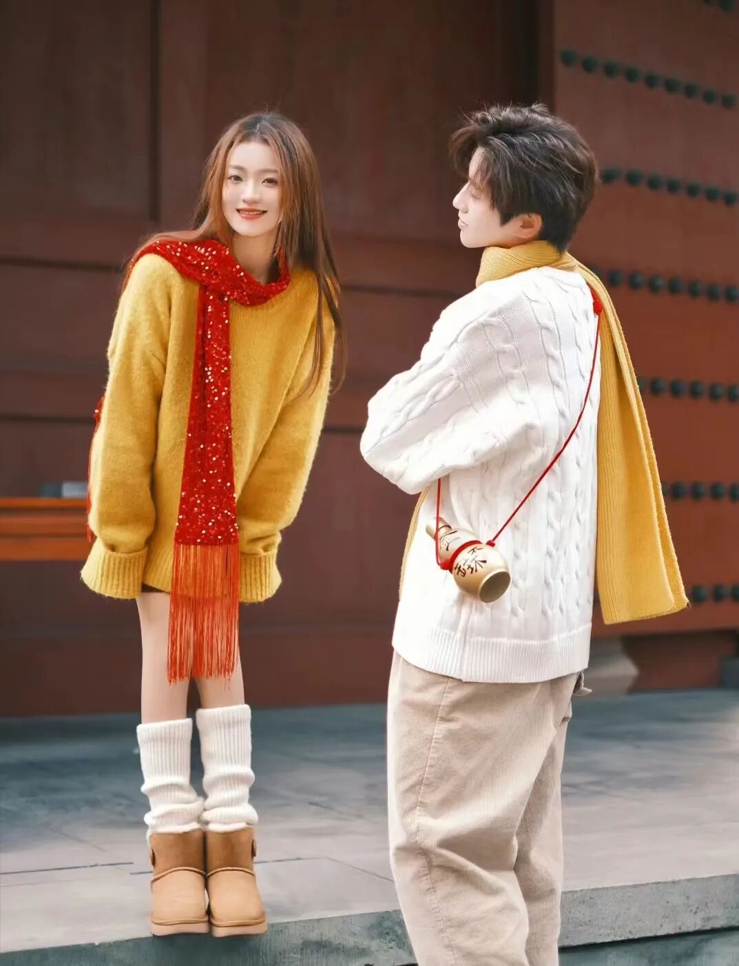 第二套情侣穿搭,“把你穿在身上”,将对方身上的元素穿在自己身上,女生穿姜黄色的毛衣,男生佩戴一条姜黄色的围巾,不仅在颜色上形成呼应,而且这样穿搭更是让人心里暖融融,仿佛是爱人在守护我的冬日。