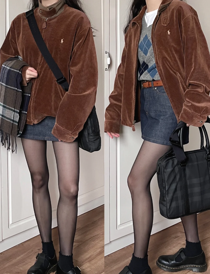 拉夫劳伦这一件灯芯绒夹克,单看妥妥老干部风,从爷爷的衣柜里应该能找到这样的一件夹克衫,女生搭配甜美菱格马甲与牛仔短裙,完美将老干部风与甜美慵懒女孩结合。