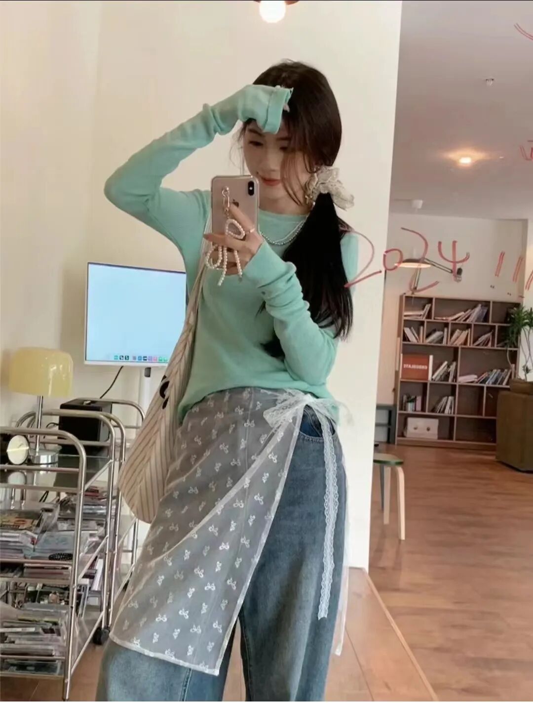 韩系辣妹风的“屁帘”穿搭,增加了更多的甜美感,灰色修身上衣搭配黑色微阔腿裤,腰间系一个不规则蕾丝纱,营造甜美随性感,不规则蕾丝纱裙也可以参考赵昭仪穿搭,不规则连衣裙内搭牛仔裤,满满艺术氛围。
