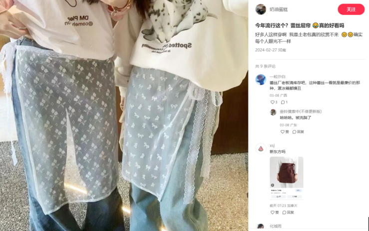 近期裤子外搭一片薄纱的穿搭火出圈,站在风口浪尖的一次审美考验,欣赏的人能将它穿出个人特色,欣赏不来的人直呼看不懂,被网友调侃为屁帘。