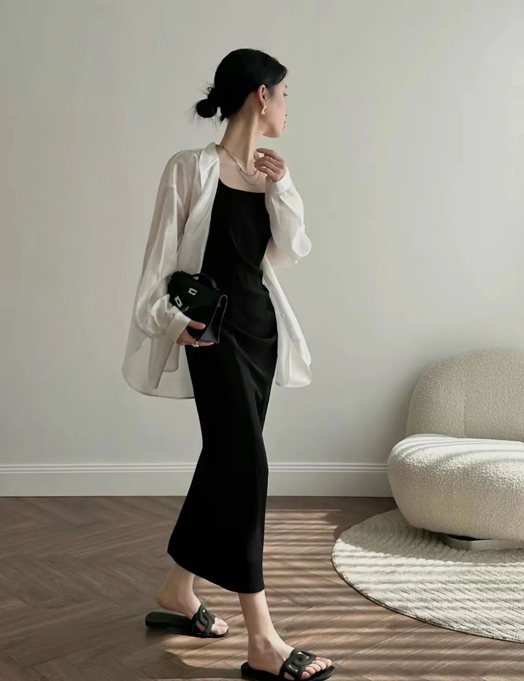 黑色长款这一件充满酷飒领导风范,气质优雅而霸气,具有疏离感的魅力。薄纱长衬衫本身轻盈凉爽,微微透视的小心机,搭配一件黑色内搭,一条黑色长裙,气场全开!