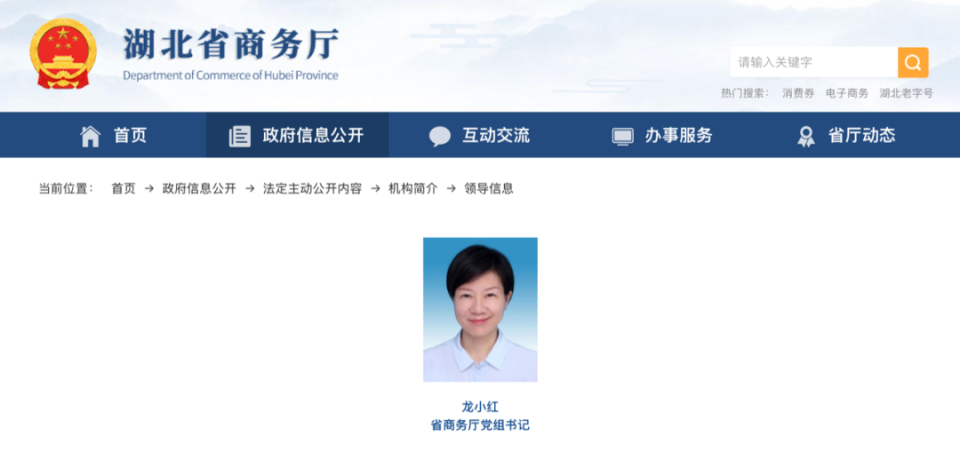 政知君注意到,湖北省商务厅官方网站“领导信息”栏目近日进行更新,据最新名单显示,龙小红已任湖北省商务厅党组书记。