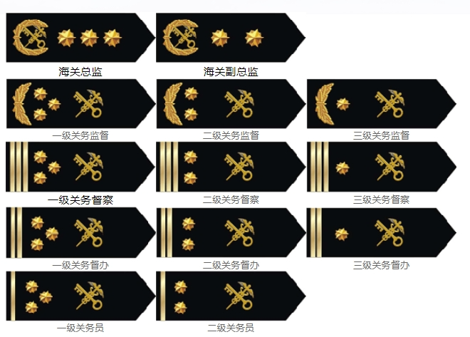一等、海关总监、海关副总监;二等、关务监督(一级、二级、三级);三等、关务督察(一级、二级、三级);四等、关务督办 (一级、二级、三级);五等、关务员(一级、二级)。