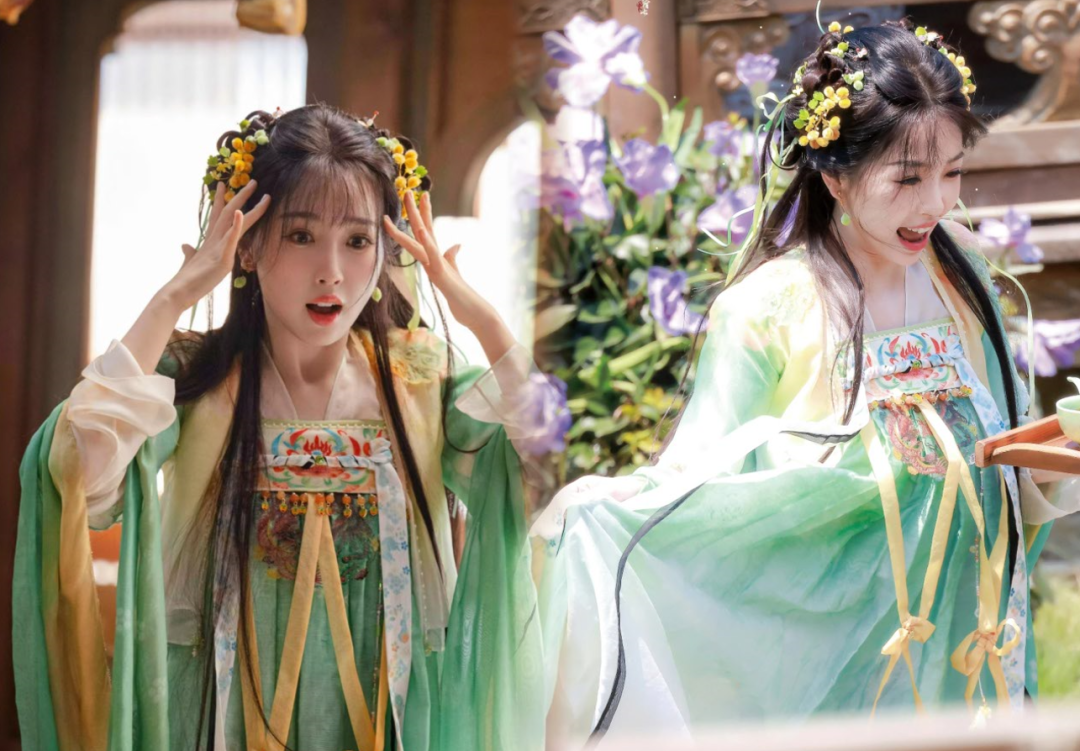 虞书欣饰演的穿书女配凌妙妙,古装妆造中凌妙妙机灵可爱,妆容精致而自然,融入了现代的时尚妆容风格,恰到好处展现角色的甜美。发型多采用传统的发髻和发簪,贴合凌妙妙的角色个性,多采用双发髻以及色彩亮丽的发簪发饰,珠花运用了诸多花果元素,且采用非遗绒花,角色造型更加灵动俏皮,与服饰的搭配极为和谐。凌妙妙的服装配色丰富大胆却和谐,刺绣花纹的服装细节并结合各种丝带串珠,角色的妆造养眼讨喜。