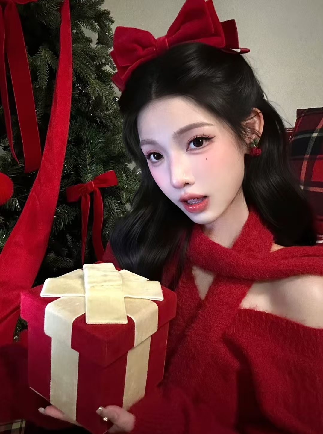 浪漫的圣诞月必须要搭配一套浪漫温柔风的圣诞穿搭,必不可少的红色系,一件斜肩款红色毛衣裙,搭配同色系腊肠围巾,一双红色系的袜子在幽绿的圣诞树旁边,红色与绿色的碰撞是一场奇妙的视觉体验。红色的立体蝴蝶结发夹也是从22年火到了24年,超出片的发饰快达到人手一个了,跟半扎发的大波浪造型适配度满分,甜蜜得如同平安夜的苹果。
