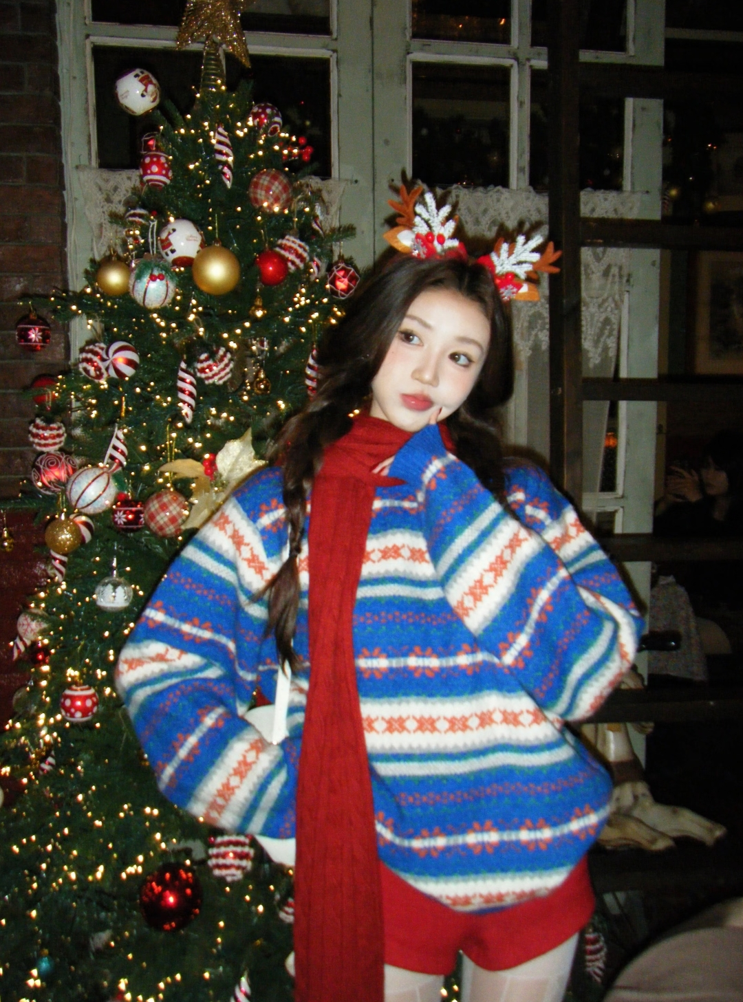 拍照出片不仅靠pose,一些出片的氛围感神器也必不可少,圣诞元素的麋鹿发箍,跟后面的圣诞树相称,复古的环境与复古的穿搭犹如置身千禧年的美国圣诞节。当然帽子也是出片秘诀之一,一顶圣诞气息浓厚的红色帽子让画面的视觉中心更加明显,亮度也有了显著提升。