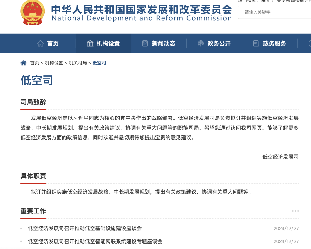 据国家发展改革委网站“机关司局”栏目12月27日更新显示,新设立了低空司,全称为低空经济发展司。