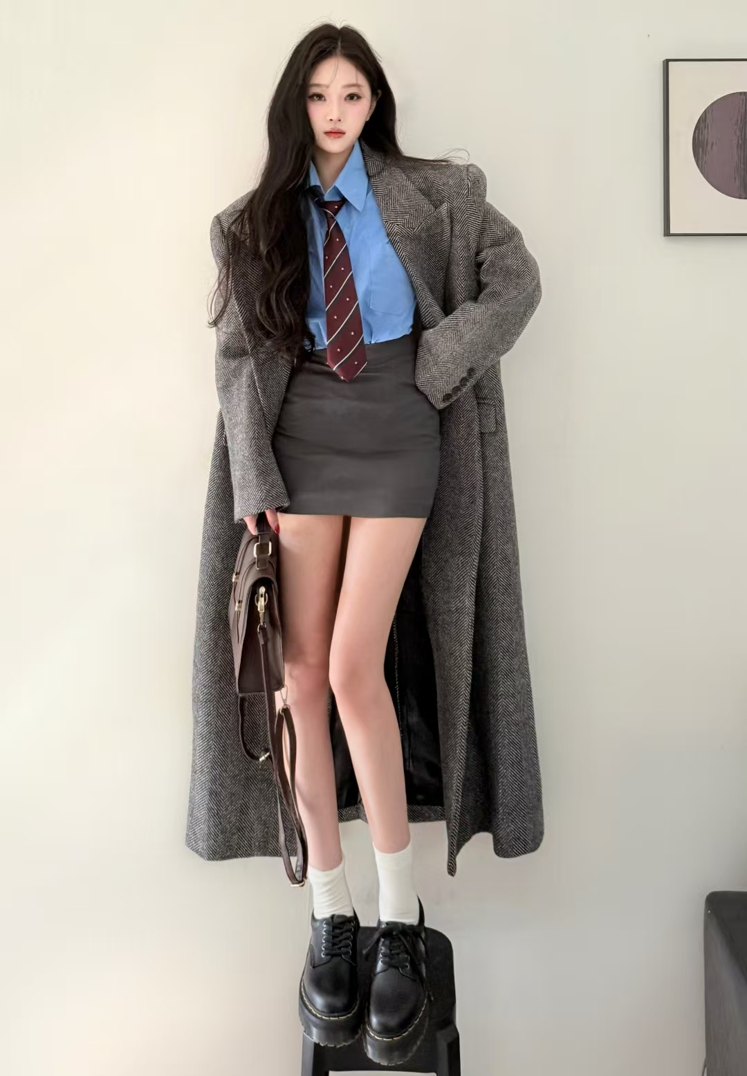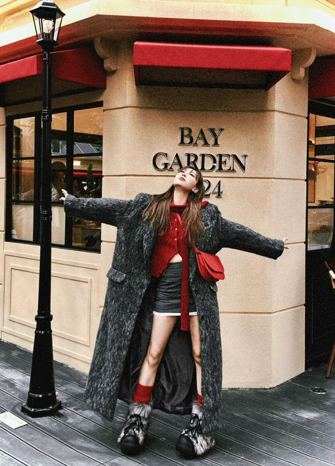 长款的格雷灰呢子外套展现出来的气场也更足,犹如女团爱豆穿搭,走在新年的街头韩系潮流感,一种反差碰撞。超长款的呢子大衣想要不压身高,还要更显高,那么搭配的内搭尽量短,短裙搭配厚底鞋,在视觉上呈现黄金比例。