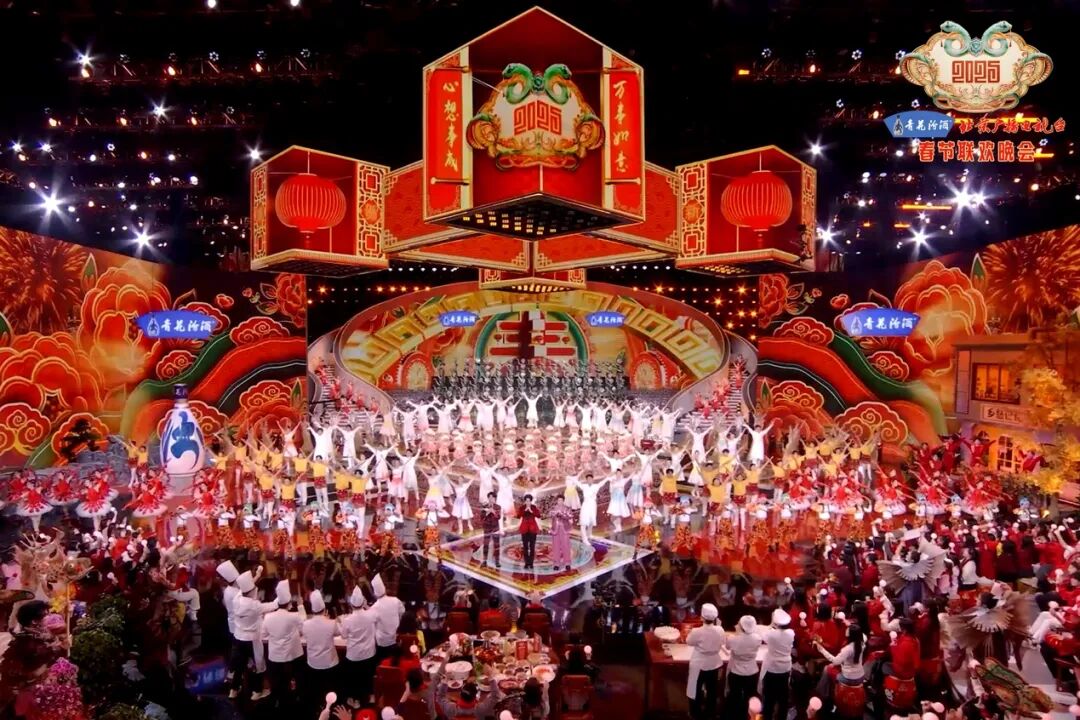 2025乙巳蛇年恰逢“春节——中国人庆祝传统新年的社会实践”成功申遗后的首个新春佳节,晚会中的诸多节目都呼应了这一里程碑时刻。在张新成、侯明昊、黄子弘凡的表演《包你幸福一年年》中,“饺子”这一跨越时空的美食符号再度被浓墨重彩地写入歌舞表演。舞台上,垒起大灶、支起锅!演员们带领观众一起包饺子、煮饺子、吃饺子,热气腾腾!彰显中国人在春节期间对于家庭与团圆的独特情感,也让传统文化在现代舞台上延续新的光彩。