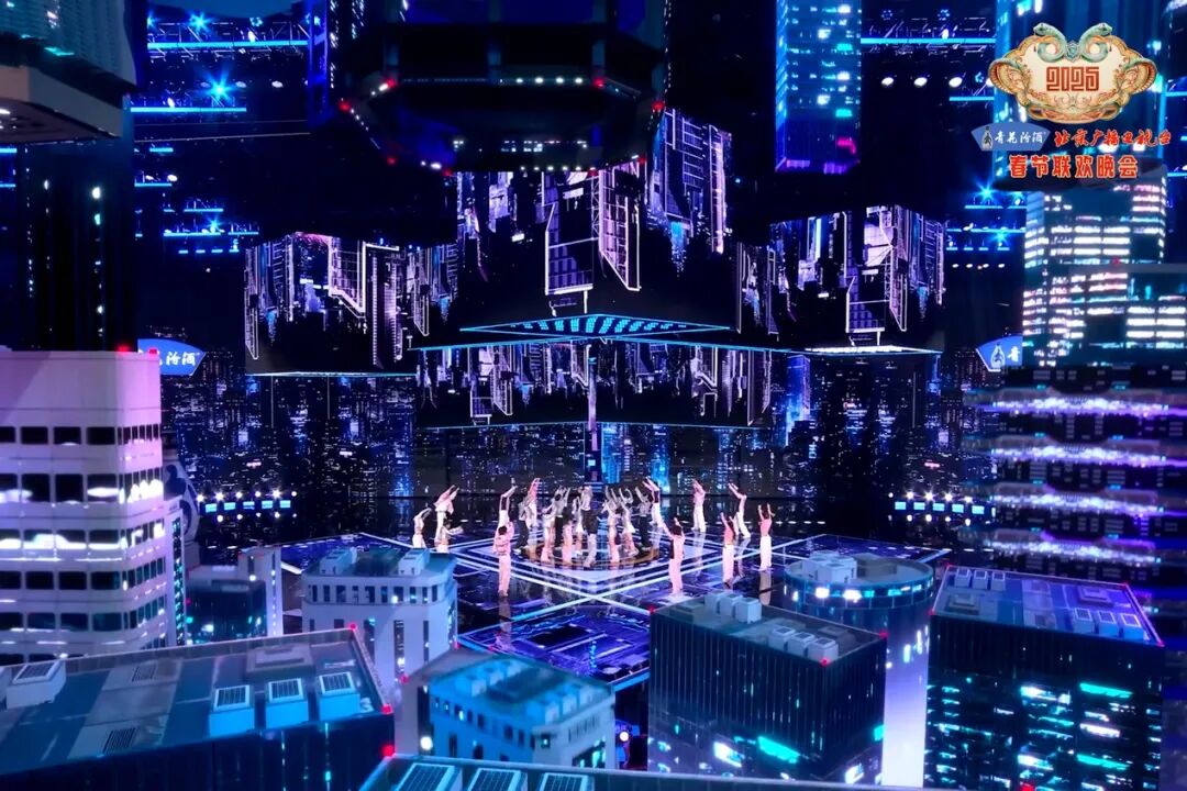 舞台艺术不仅关乎音乐与舞蹈的结合,也在于空间形态与视觉语言的塑造。2025北京台春晚在舞美设计上进行了一系列探索,中心舞台区由八组数控升降机组成,俯瞰的形状是中国传统的吉祥纹样,寓意着“平安吉祥”;舞台后方由八组竖屏组合而成,寓意着“福满八方”。整场晚会通过4K制播、升降台、多屏联动、数控灯光以及AIGC特效等多种技术手段的融合,打造出融会现代科技与生活场景的沉浸式空间,也让今年的歌舞类节目视觉效果呈现出超越“晚会”的质感。
