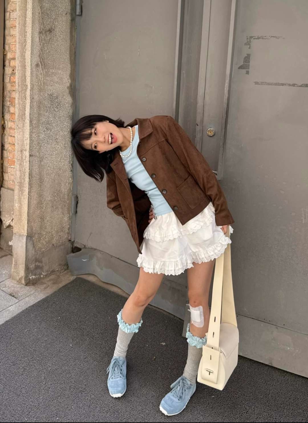 质感拉满的棕色系,像一杯浓郁的热可可,丹宁蓝注入街头灵魂,牛仔裤破洞设计打破常规;baby蓝的上衣搭配纯白色蓬蓬裙,又是另一种感觉,既保留了少女的灵动感,又注入了酷飒气场。